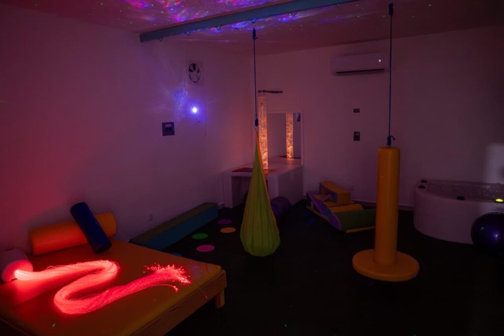 Este espacio incorpora equipo como pelotas terapéuticas, columpios y texturas, que permiten trabajar la estimulación vestibular y propioceptiva, así como actividades enfocadas en mejorar la coordinación, el equilibrio, la concentración, el bienestar emocional y la autonomía de las personas usuarias.